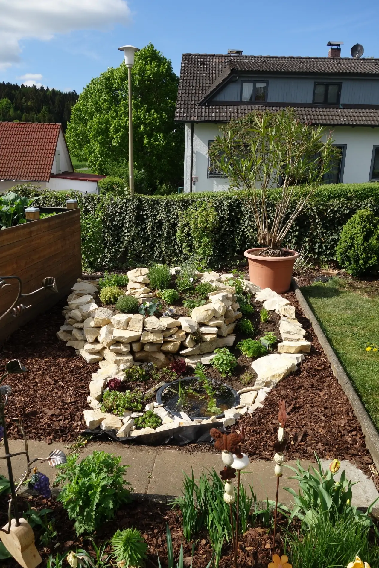 Dazu sind lediglich ein paar Natursteine oder Ziegel nötig, die spiralförmig in die Höhe gebaut werden. Durch die unterschiedlichen Klimazonen innerhalb der Spirale finden mediterrane Kräuter wie Rosmarin oder Thymian im oberen Bereich optimale Bedingungen. Heimische Kräuter wie Petersilie oder Schnittlauch gedeihen hingegen bestens im unteren, feuchteren Teil. Die Spirale stellt zudem nicht nur einen Blickfang dar, sondern schafft ebenso einen wertvollen Lebensraum für Insekten.